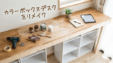 ニトリのカラーボックスで作業机を作ってみました。自分専用のアトリエのような広い作業スペースが欲しいなと思いついたのが、カラーボックスに天板を繋げてデスクにする方法。