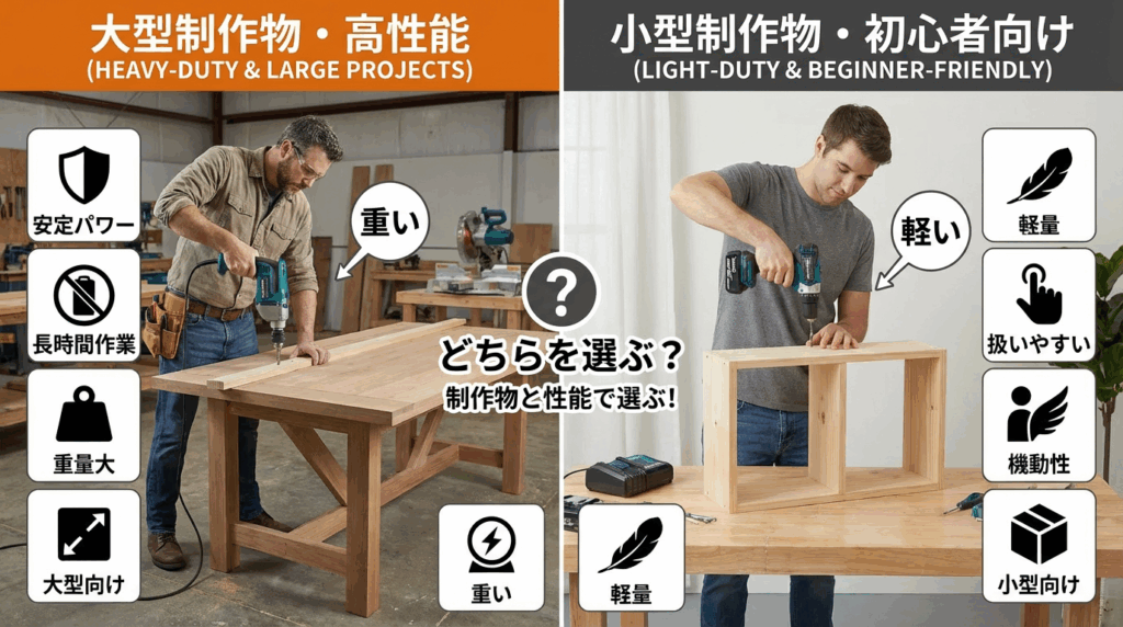 | メリット | コンセントが近くになくても使える。 コードが邪魔にならない。 取り回しが良い。 | 工具本体価格が安い。 バッテリーの消耗を気にしなくて良い。 長時間の安定した作業に向く(トルクが落ちない)。 |