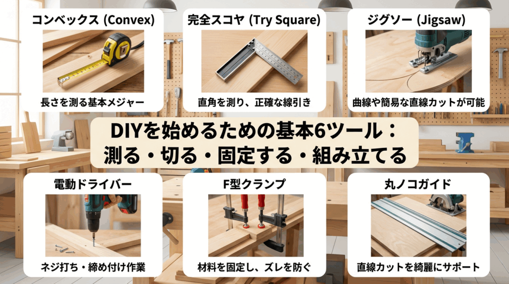 DIYを始めるにあたり、「測る・切る・固定する・組み立てる」という基本作業を行うために、以下の6つの基本ツールから揃えることがおすすめです。
